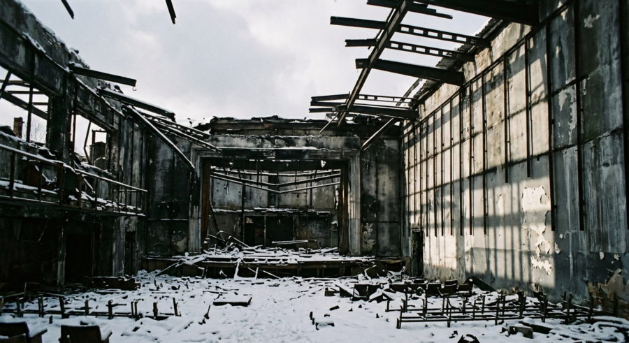 Мы пришли к театру в густых сумерках. Обугленное здание высилось над районом как гнилой скелет. Мы пролезли внутрь через пролом в стене. Внутри пахло старой гарью, а тишина была такой плотной, что её можно было резать ножом. Мы шли по главному залу, под ногами хрустели обгоревшие декорации и копоть.