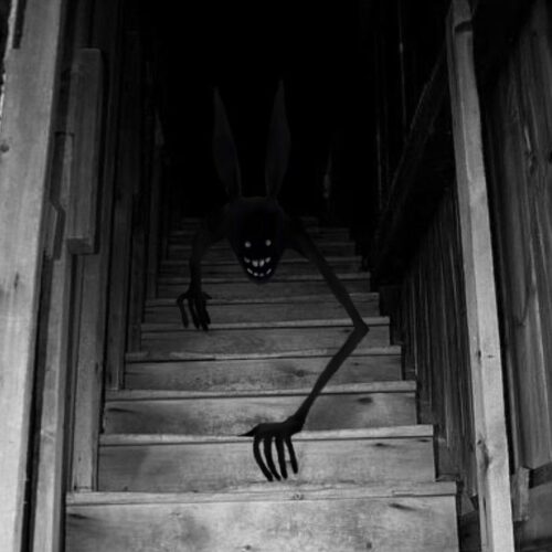 В темноте сверкнули два белых огня, похожие на глаза. Они были большими и смотрели на меня. А потом… Потом появилась зловещая и зубастая, белая улыбка. Я стал замечать очертания чего-то большего и длинного над головой этого силуэта. Похожее на уши зайца или кролика.